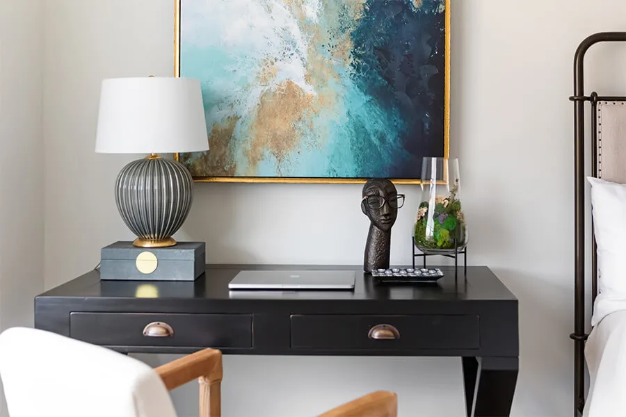 The personalized decor made the space more meaningful and strengthened their emotional attachment to the room and their home. Tasteful family photos in gorgeous frames helped them remember why they worked so hard everyday. Other art in the room – such as a favorite vacation – allows them to appreciate their life and being home together.